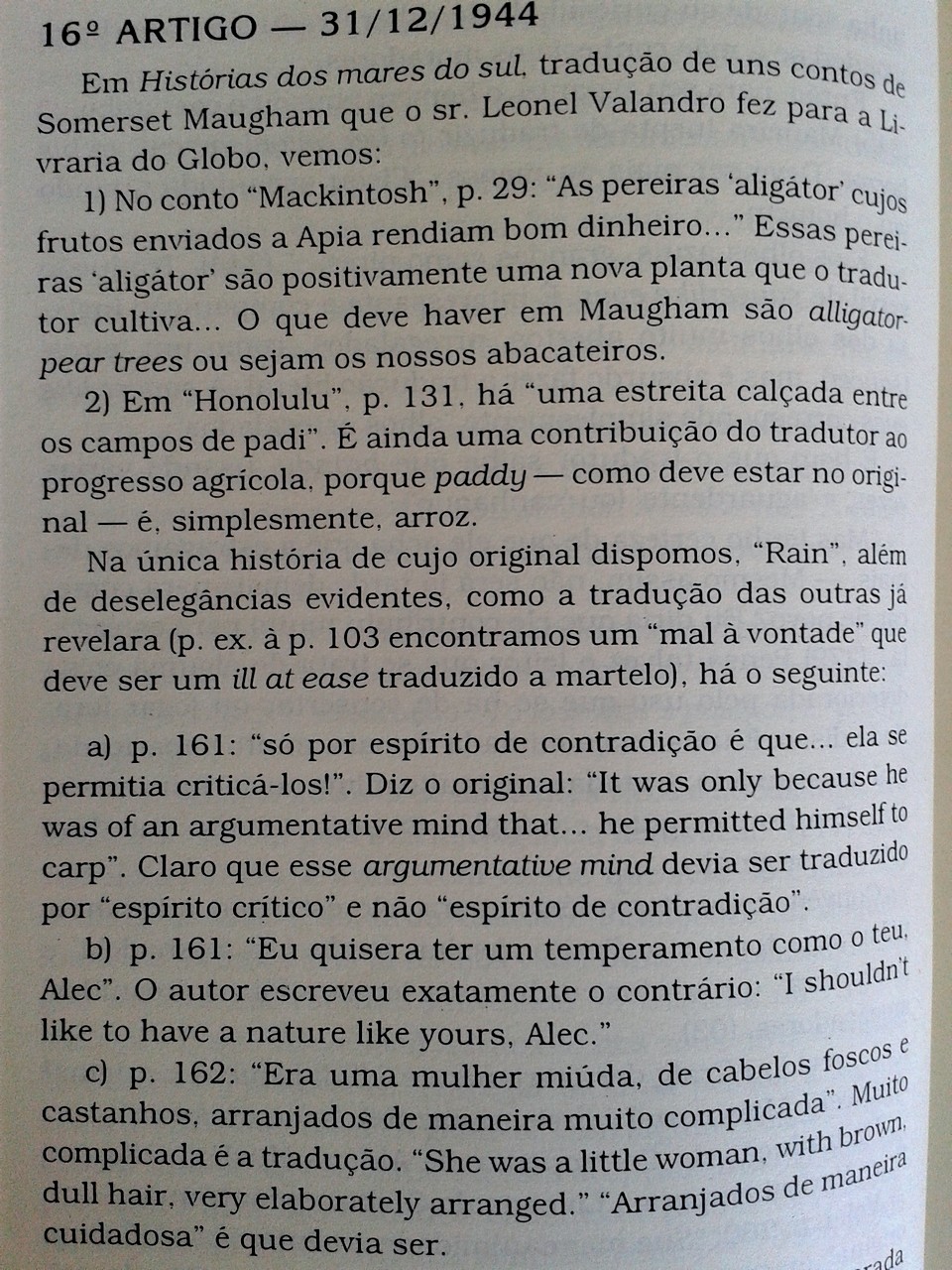 Enquanto escrevia a postagem anterior, sobre os erros que encontrei na tradução de “Retrato do Artista Quando Jovem” feita por José Geraldo Vieira, descobri que na década de 1940 um sujeito fazia trabalho semelhante. Em coluna semanal para o Diário de Notícias, do Rio de Janeiro, Agenor Soares de Moura expunha, corrigia e explicava os erros que encontrava em traduções de literatura, filosofia, história. Seus artigos foram reunidos e publicados em 2003, no livro intitulado “À margem das traduções” (mesmo nome de sua coluna no jornal), pela editora Arx. O trecho que vai na imagem é um exemplo do trabalho desse crítico de traduções que, apesar de duro, era bastante didático e bem-humorado.